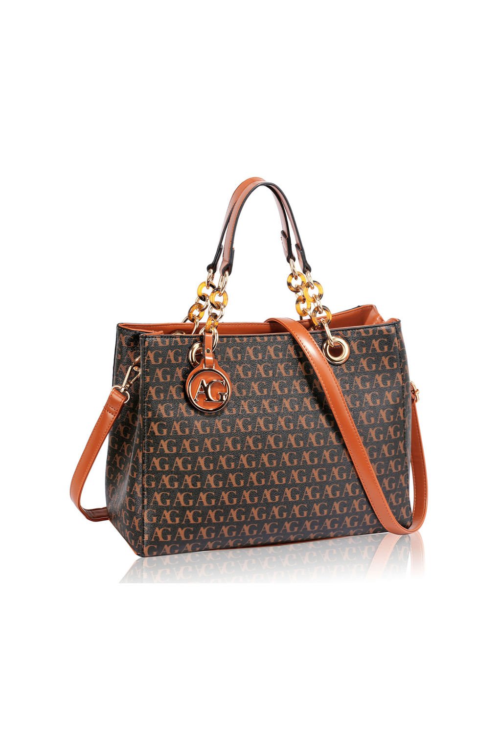 Luxusní kousek z britské dílny Anna Grace je připraven s vámi vyrazit do společnosti. Je vyroben z černé eko kůže s hnědými monogramy AG. Vnitřní prostor je rozdělen velkou zipovou kapsou na dvě části. Vpředu kabelky je přívěsek s monogramem Anna Grace.